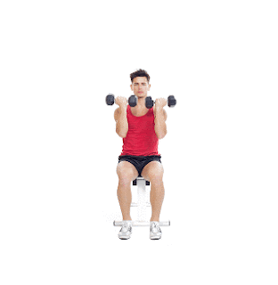 1.Sit on a flat bench and hold a pair of dumbbells at the level of your shoulders. Your palms should be facing the inward, and your elbows should point to the side.