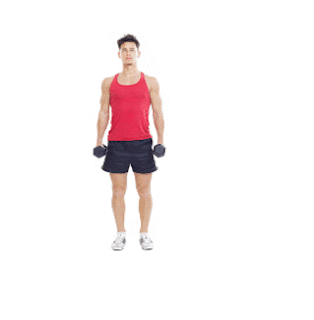 1. Standing upright, hold a pair of dumbbells by your side with arms extended downward.