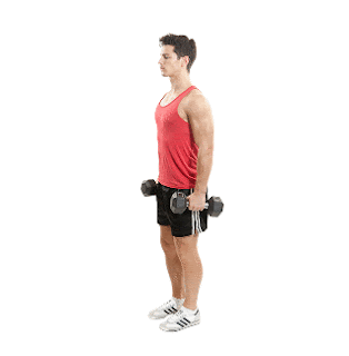 Hold a dumbbell in each hand with palms and weight outward. The arms should form a 90 degree angle. Keeping close to your body and elbow in a stable position , curl the weight up towards your shoulder .Lower weight to the starting position.