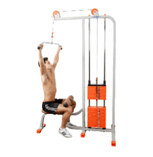 Attach a long bar to the lat pulldown machine, and adjust the thigh pads so that when you are sitting your knees are at right angles and feet flat on the ground. Grasp the bar using a wide grip and sit down maintaining the upper body in an upright position,slightly leaning back from the hips.Pull the bar infront of your face to the top of your chest and pause. Slowly release the bar back to the starting position by straightening your arms.