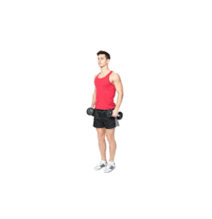 Stand with your feet slightly spread. Keep your back straight, your arms hanging at your sides, holding one dumbbell in each hand: - Raise the dumbbell to shoulder level, keeping your elbows slightly bent. -Return to the starting position.