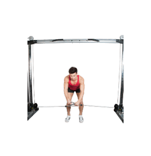 Stand with your feet and your knees slightly bent. Bend forward at the waist, keeping your back straight and your arms hanging down. Hold a handle in each hand with the cables crossing each other: -Inhale and raise your arms to the sides until your hands are slightly above the level of your shoulders. -Exhale as you complete the exercise.
