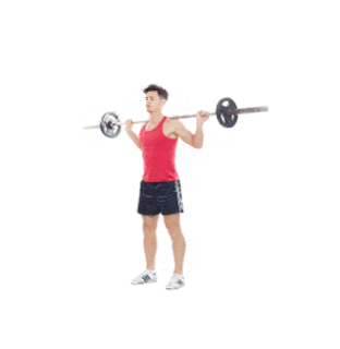 1. Standing upright, hold a barbell behind your head at shoulder height with your hands shoulder width apart, elbows bent, and palms facing forward.