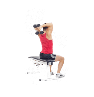 2. Keep your upper arms stable as you lower the dumbbells behind your head until your forearms are just pass parallel to the floor.