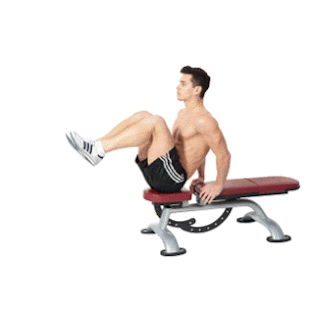 Sit onthe edge of a bench and hold the seat behind your back for support. extend your legs in front of you. knees bent slightly. Rise your legs toward your chest and bring your chest toward your knees.